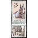 Dvě poštovní známky ČR č. 844 spojené kuponem K1 (kostel sv. Kateřiny), Chomutov – VI. českoněmecká filatelistická výstava.