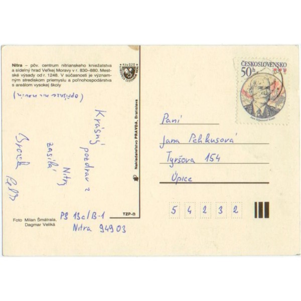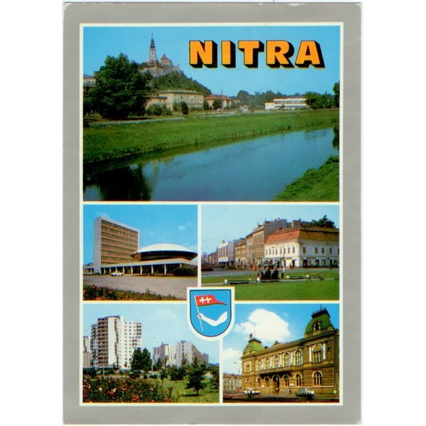 Pohlednice Nitry zobrazující hrad a centrum města. Prošlá poštou.