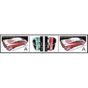 Dvě poštovní známky ČR č. 1045 spojené kuponem K2+K1 (zelené auto / červené auto), Český design: Václav Král.