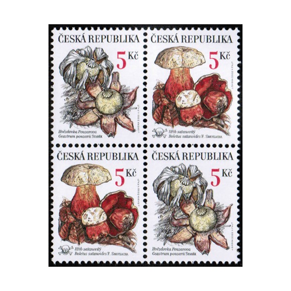 Poštovní známky ČR č. 264 a 265 ve 4bloku spojené v pořadí Hvězdovka + Hřib / Hřib + Hvězdovka, Ochrana přírody - vzácné houby.