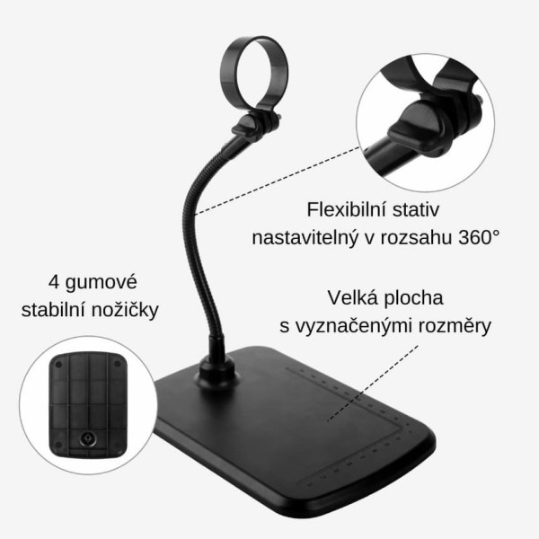 Mikroskop lze ze stojánku vyjmout. Stojánek je ohebný a díky základně stabilní. Měřítko je na stojánku vyznačeno, ale viditelnost je zhoršená.