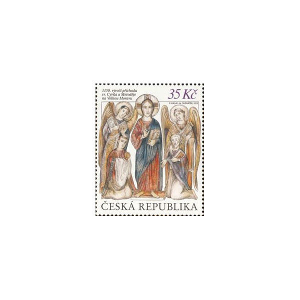 Poštovní známka z aršíku ČR č. A767, 1150. výročí Cyrila a Metoděje.
