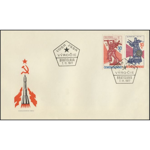 Obálka FDC ke známkám ČSSR č. 2281 a 2282, 60. výročí Velké říjnové socialistické revoluce a 55. výročí vzniku Svazu sovětských socialistických republik.