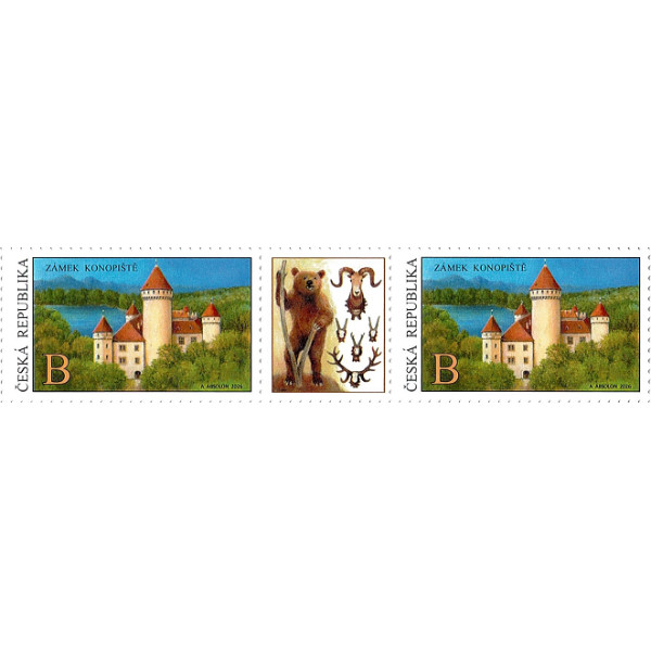 Poštovní známky č. 1355 ČR ze sešitku ZSL82 spojené kuponem K2 (lovecké trofeje), Krásy naší vlasti: zámek Konopiště.